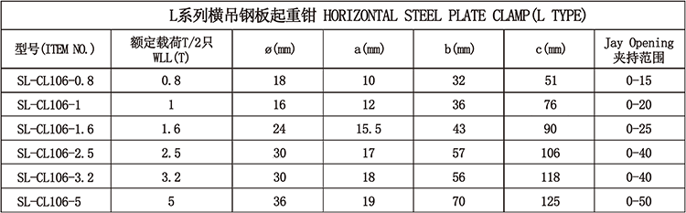 1、用途:适用于钢板水平吊装。 2、采用低碳合金钢模锻而成。 3、载荷范围:0-5吨。 4、以两只试验为额定载荷。吊装作业时两只或四只配套使用。钢板较大时加平衡梁。 5、试验载荷